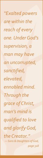 “Every day we should make advancement in gaining perfection of character, and this we shall certainly do if we press toward the mark for the prize of our high calling in Christ Jesus. Let us not talk of the great power of Satan, but of the great power fo God.” – Sons and Daughters of God, page328