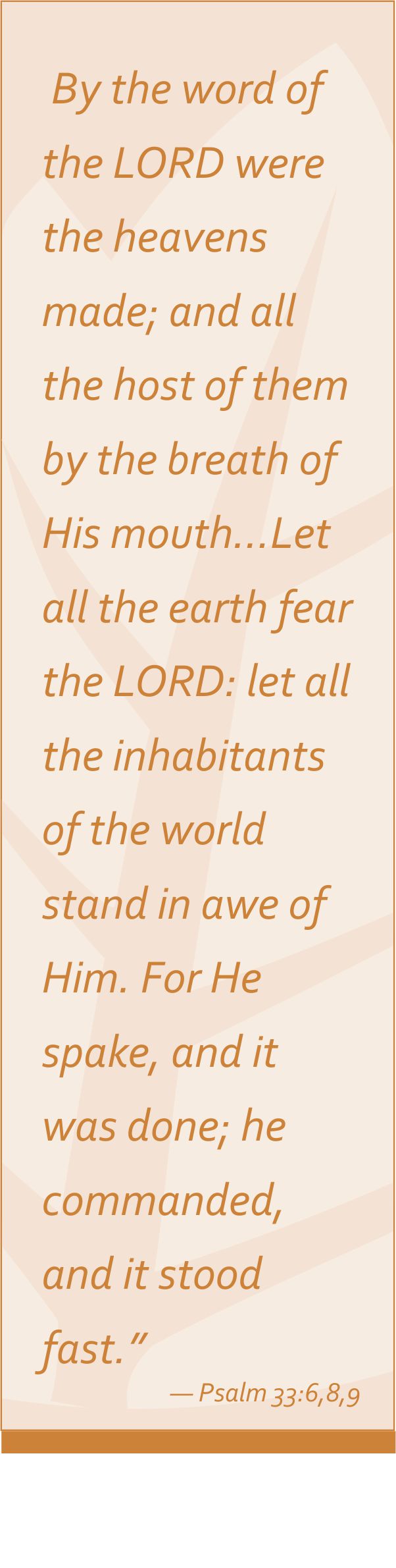 As we try to grasp the magnitude of God's creation, of the however many millions of worlds circling the throne of Deity, we get an enlarged conception of the greatness of God. Wonderful in wisdom, knowledge and power must be our God. If we can think of the significance of what this world is in relation to the whole universe, it takes on even greater proportions. “He created it not in vain, He formed it to be inhabited.” – Isa 45:18