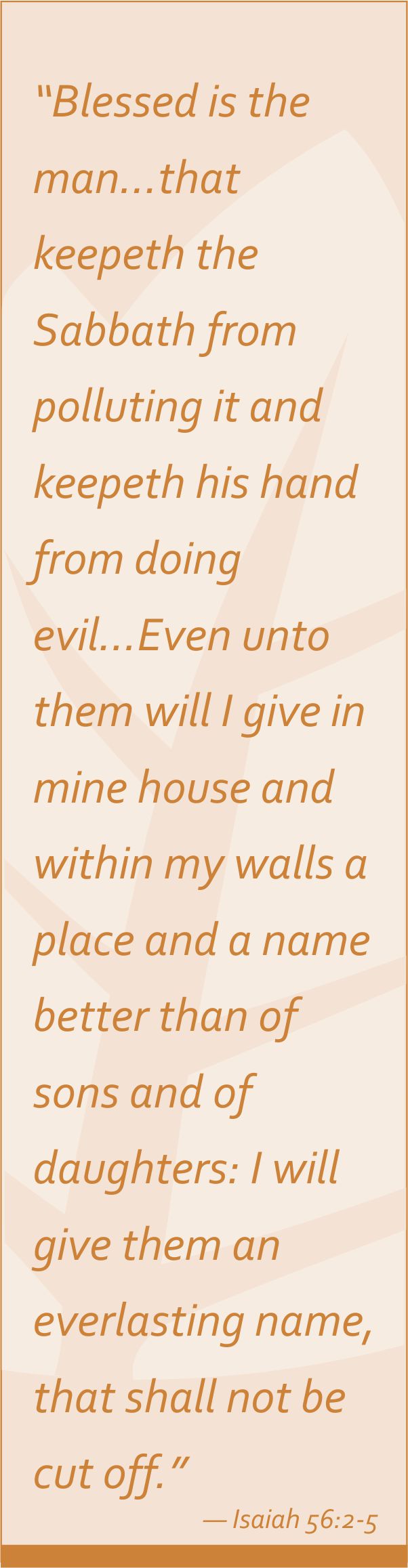 In these verses God combines sanctification and the Sabbath, saying the latter – the Sabbath, is a sign of the first – sanctification. These are companion statements to those in Isaiah 56, “Blessed is the man that doeth this, and the son of man that layeth hold on it; that keepeth the Sabbath from polluting it and keepeth his hand from doing evil.” – Isa. 56:2. To “the eunuchs that keep my Sabbaths, and choose the things that please me, and take hold of my covenant,” God says, “Even unto them will I give in mine house and within my walls a place and a name better than of sons and of daughters: I will give them an everlasting name, that shall not be cut off.” – Isa. 56: 4,5.