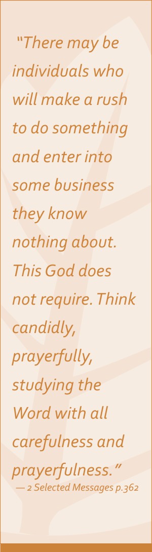 “There may be individuals who will make a rush to do something, and enter into some business they know nothing about. This God does not require. Think candidly, prayerfully, studying the Word with all carefulness and prayerfulness, with mind and heart awake to hear the voice of God. . . . To understand the will of God is a great thing. . . .