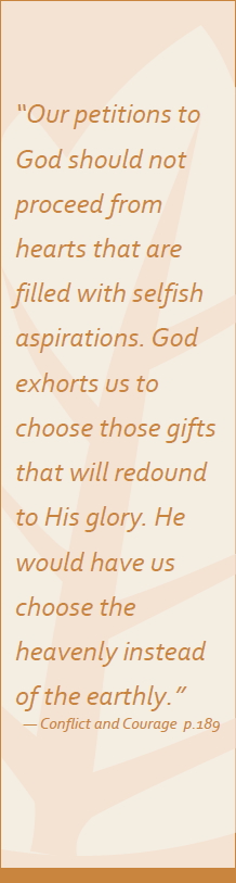 It has been said that prayer from the human heart is an effort to make God change His mind. Many make no effort to find out what God wants, although they are very clear on what they want. They struggle with God; they agonise in prayer; they demand from Him what they believe should be done their way. It doesn't occur to them that they first should find out if God really wants me to have the things I desire. Is it for my good? Is it the will of God? Has the time come for it to be fulfilled? Is there some preparation on my part before the prayer is rewarded? Am I really willing to submit everything to God so that if He does not give me what I desire, I will be satisfied and thank Him for what He does give; or am I really more intent on getting what I want, rather than giving myself completely to God’s will?
