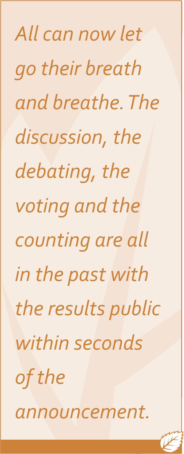The vote was to be taken on the motion at 4.30pm, after allowing the full business day to be given to this topic. At 4.30pm discussion on the motion was halted, the vote was taken by secret ballot and counting started. Within about an hour, the results were announced;