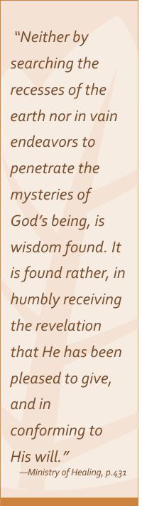 Come much closer to our day, the Spirit of Prophecy confirms the limitations of man’s knowledge and understanding. “Neither by searching the recesses of the earth nor in vain endeavors to penetrate the mysteries of God's being, is wisdom found. It is found, rather, in humbly receiving the revelation that He has been pleased to give, and in conforming the life to His will. Men of the greatest intellect cannot understand the mysteries of Jehovah as revealed in nature. Divine inspiration asks many questions which the most profound scholar cannot answer. These questions were not asked that we might answer them, but to call our attention to the deep mysteries of God and to teach us that our wisdom is limited; that in the surroundings of our daily life there are many things beyond the comprehension of finite beings.” —Ministry of Healing, p.431