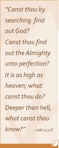 This was very real to Job in his time of severe trial. “Canst thou by searching find out God? Canst thou find out the Almighty unto perfection? It is as high as heaven; what canst thou do? Deeper than hell; what canst thou know? The measure thereof is longer than the earth, and broader than the sea.” —Job 11:7-9