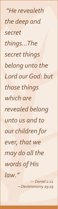 So God gives knowledge by revelation of His word, but not only knowledge, He gives a deep knowledge of even secrets. “He revealeth the deep and secret things… The secret things belong unto the LORD our God: but those things which are revealed belong unto us and to our children for ever, that we may do all the words of this law.” —Daniel 2:22; Deuteronomy 29:29