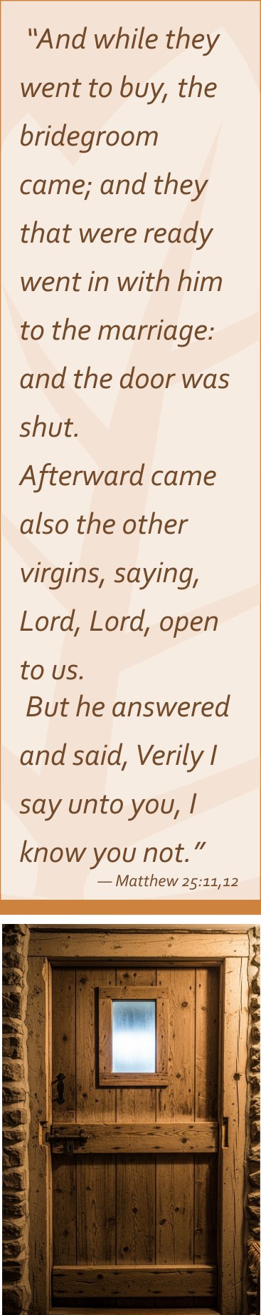 Many are deceiving themselves by thinking that the character will be transformed at the coming of Christ, but there will be no conversion of heart at His appearing. No, the door will be shut. Jesus goes on to say in the parable that when the door is shut, those who come to Him, He doesn’t know.