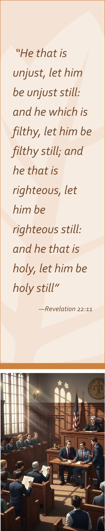 When the Lord comes, those who are holy will be holy still. Those who have reserved their bodies and spirits in holiness, in sanctification and honour, will then receive the finishing touch of immortality. But those who are unjust, unsanctified, and filthy will remain so forever. No work will then be done for them to remove their defects and give them holy characters. The Refiner does not then sit to pursue His refining process and remove their sins and their corruption. This is all to be done in these hours of probation. Please realise the seriousness of the hours in which we live. It is now that this work of cleansing of sin is to be accomplished in us.