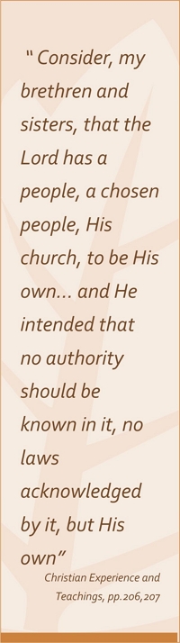 To emphasise these words, “God has a church. It is not the great cathedral, neither is it the national establishment, neither is it the various denominations; it is the people who love God and keep His commandments. 'Where two or three are gathered together in my name, there am I in the midst of them.' Where Christ is even among the humble few, this is Christ's church, for the presence of the High and Holy One who inhabiteth eternity can alone constitute a church.’
