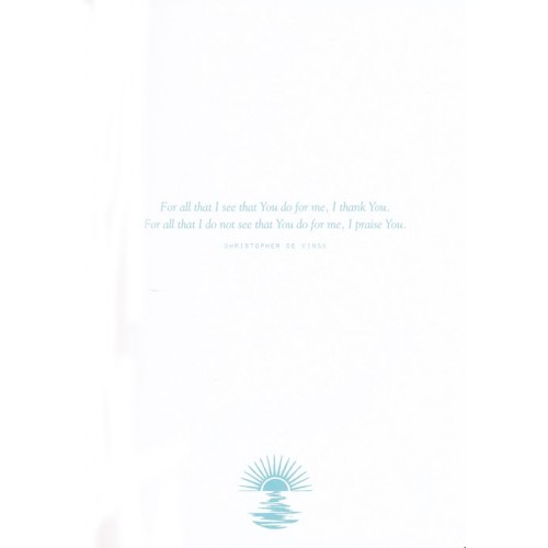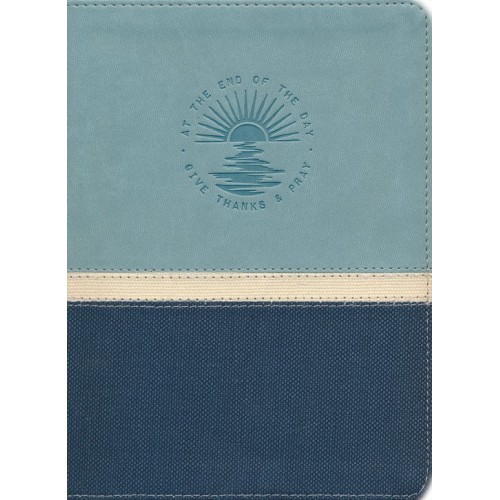 Deluxe journal with top stitching, and a fabric and faux leather cover. Navy, aqua and tan colour featuring debossed art "At the end of the day, give thanks and pray."