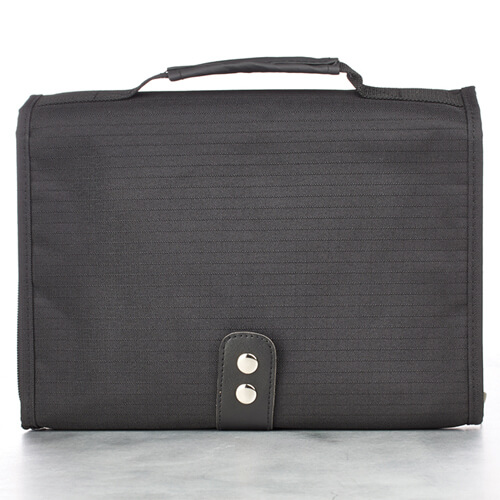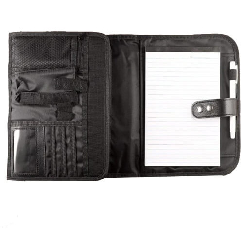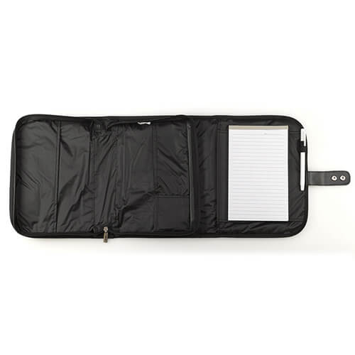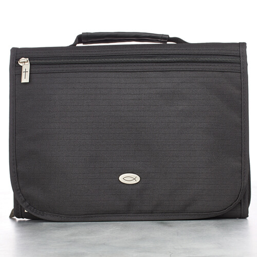Stay organized with this tri-fold Bible case that features multiple pockets, a sturdy spine carrying handle, notebook and pen. Made from durable polyester material, this organiser-style Bible case folds in and secures to protect your Bible and all of your other belongings.