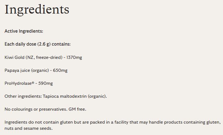 New Zealand freeze-dried gold kiwi fruit and organic papaya are also included due to their naturally occurring digestive enzymes.