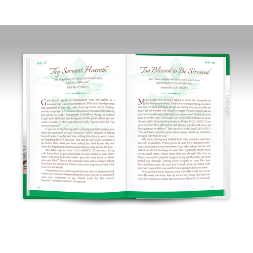 Unlike your typical devotional with a reading for each day of the year, Strength for Today is timeless. You can read one page each day or use the index to find a topic that speaks to your life at that moment. On each page, you will find a message of hope and love that will lift your heart toward heaven.
