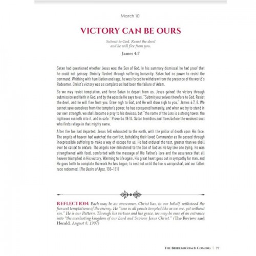 Based on the classic work The Desire of Ages by Ellen G. White, The Bridegroom Is Coming features 366 devotionals, each one designed to help you prayerfully and worshipfully behold Jesus so that you can become more like Him in heart, mind, and spirit.