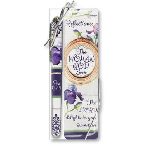 The Woman God Sees, bookmark and pen set with floral design packaged in an acrylic box with silver bow for a ready-to-give gift.